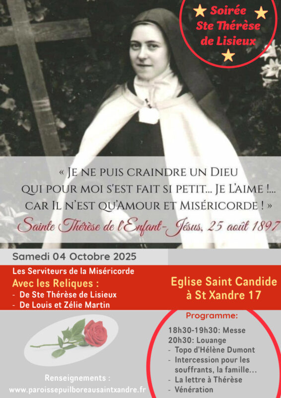 Le Père Lazare, la paroisse de Puilboreau-St Xandre et le mouvement “Viens et vois”, accueilleront Hélène Dumont (ministère autour de la Miséricorde Divine) pour notre soirée-fête de Ste Thérèse de Lisieux, que nous avons lancée en 2024. Elle viendra avec des petites reliques de Ste Thérèse Louis et Zélie Martin !!!